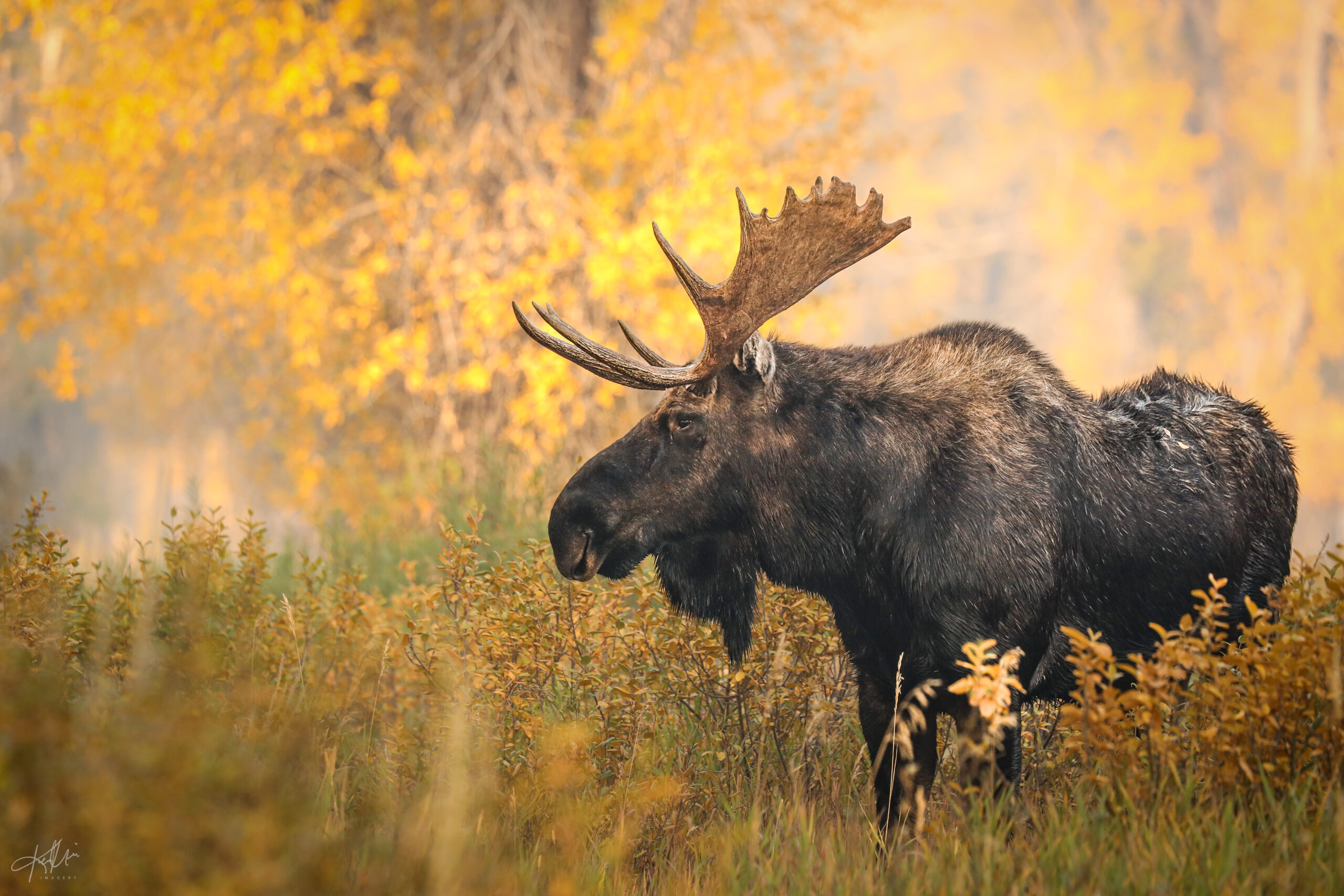 A majestic bull moose stands on guard during the rut surrounded by autumn color, Grand Teton National Park, Wyoming.