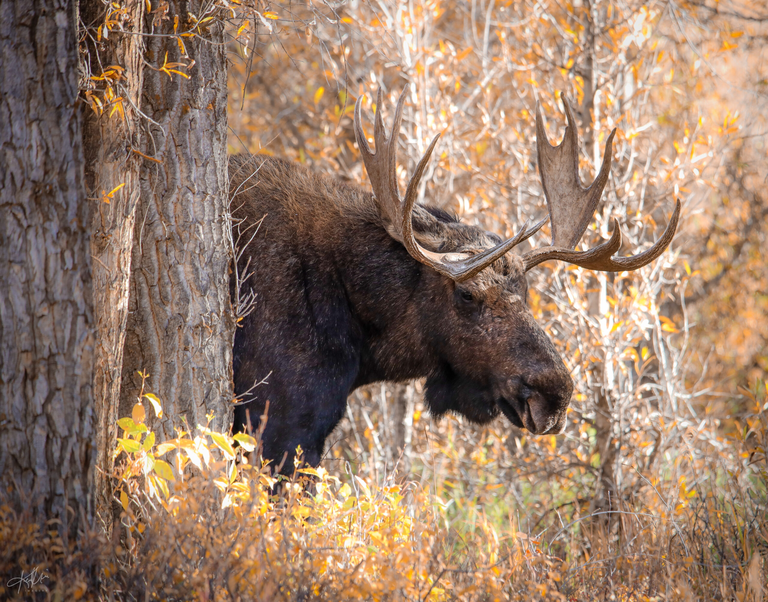 A majestic moose peaks from behind a cottonwood tree admit the golden willows, Grand Teton National Park, Wyoming.
